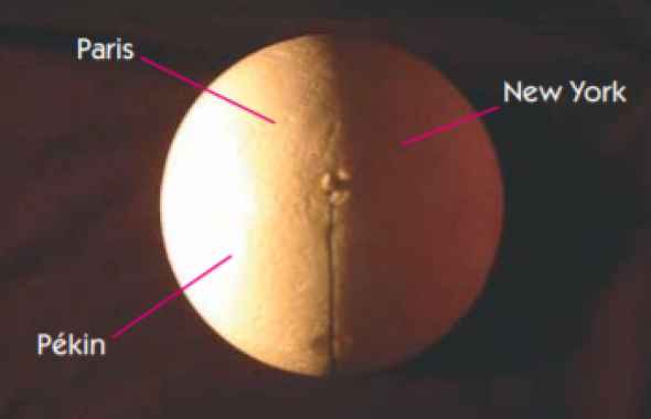 A ce stade, il n'est pas encore possible de répondre à la question. Tout ce qui peut être affirmé c'est que Pékin se trouve à la limite de la journée et de la nuit. Pour savoir s'il s'agit du début ou de la fin de la journée il faut connaître le sens de rotation de la Terre sur elle-même. Cette séance a pour but de faire émerger la question. (collectivement, par petits groupes puis collectivement) |