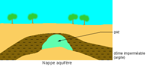 Une nappe aquifère est une réalisation artificielle d'un gisement de gaz dans une roche poreuse et perméable (calcaire ou grès) entre -300 et -1200 mètres. Cette roche est surmontée d'une couche de terrain imperméable (argile en général) afin de stopper l'ascension du gaz naturel. La forme des nappes est le plus souvent un dôme.