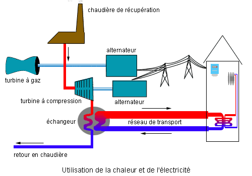 Dans une centrale thermique à flamme, c'est la vapeur d'eau sous pression qui produit l'électricité en entraînant des turbines. Cette vapeur d'eau doit être refroidie afin de continuer son cycle. Pour cela, on utilise généralement un circuit de refroidissement qui dissipe et donc perd la chaleur. Avec la cogénération, on utilise cette chaleur pour le chauffage urbain, par exemple. Le circuit de refroidissement est composé de longs tuyaux qui rejoignent les habitations. Il y a alors échange de chaleur entre ces tuyaux et le circuit de chauffage des habitations. Après cet échange, l'eau du circuit de refroidissement retourne à la centrale thermique où elle est à nouveau réchauffée puis repart vers les habitations et ainsi de suite.