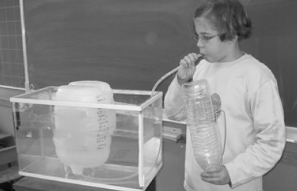 L’enseignant présente aux élèves le matériel utile pour réaliser une sorte de spiromètre ou présente le dispositif déjà réalisé, qu’il demande aux élèves de reproduire, plusieurs problèmes (taille et graduation du réservoir) restant néanmoins à résoudre.