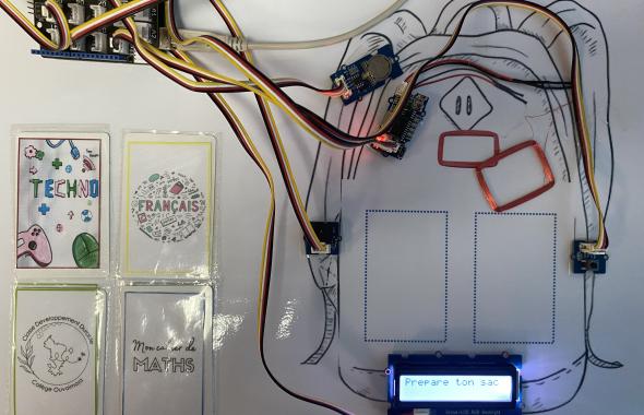 Le dispositif repose sur l’utilisation de cartes RFID associées aux fournitures scolaires. Le sac est équipé d’une carte Arduino UNO, d’une horloge, d’un module de lecture RFID, d’un écran LCD et d’un buzzer. L’élève déclenche un cycle de vérification au cours duquel chaque fourniture détectée est validée par un affichage visuel et un signal sonore. Les fournitures manquantes sont identifiées et signalées en temps réel.