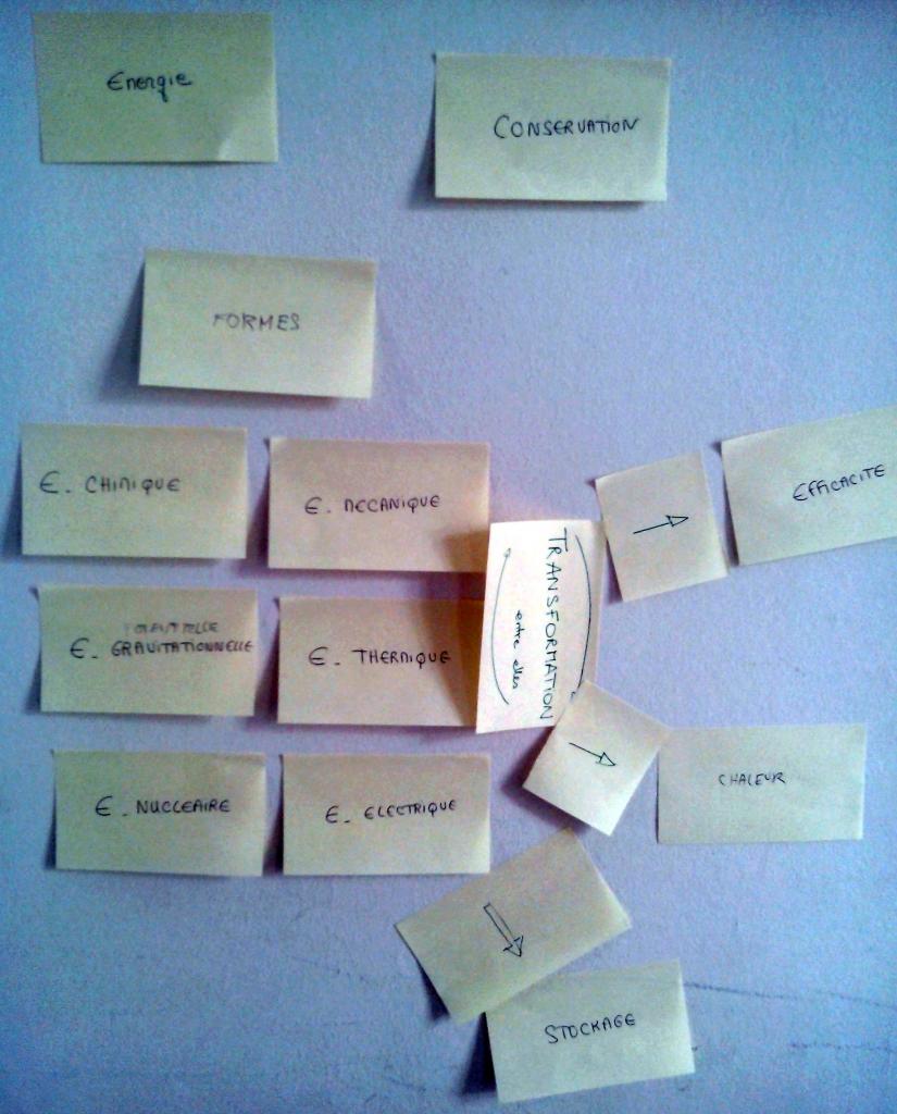 - Organiser ensuite l’ensemble de ces notions de manière cohérente (affichage des post-it au mur, sur une affiche…) : déterminer des groupes, puis une disposition spécifique de ces groupes signifiant leur degré de relation, ajouter des liens éventuellement qui peuvent être légendés…