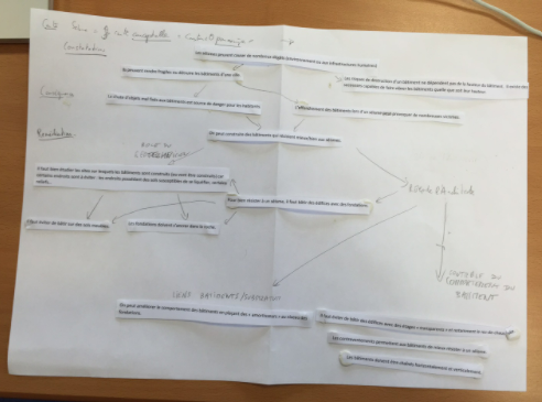 - Il n'est pas toujours aisé, en formation de demander aux participants de partir d'une page blanche. Ce type de travail est facilité lorsque les professeurs ont suivi des ateliers d'investigation, des interactions avec des scientifiques... autour de la thématique abordée. Typiquement lorsque la formation comprend deux jours, l'atelier de production de carte conceptuelle peut s'effectuer lors de la dernière demi-journée. Il est alors possible de débuter l'atelier par le jeu du "maillon faible".