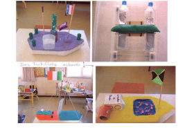 - prévoir des objets homogènes comme pâte à modeler, cuillère en bois, bouchons de liège ou assimilé, capsule de bouteille, cuillère en alu ou inox, polystyrène, morceaux de bois…), bacs contenant de l’eau pour chaque groupe, des protections pour les élèves (des grands sacs plastiques troués par ex), des serpillières et de quoi sécher les élèves (serviettes, torchons)