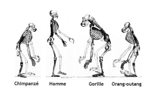 Nos plus proches parents dans la nature actuelle sont donc les chimpanzés et notre ancêtre commun remonte à 8 millions d’années. Nous partageons a priori avec nos plus proches cousins 99% du génome et donc de nombreux caractères aisément observables. Parmi ceux-ci, le plus remarquable est probablement la présence d’un coccyx. L’ancêtre commun à tous les grands singes n’avait pas de queue apparente : celle-ci s’est transformée au cours de l’évolution en deux os. Le premier, le sacrum, de forme trapézoïdale, est formé de 5 vertèbres soudées. Il est prolongé par le coccyx, formé de 4 à 6 vertèbres soudées. Le coccyx termine la colonne vertébrale. Cette évolution est une adaptation à la bipédie. Aujourd’hui, il n’existe qu’une quinzaine d’espèces dans la nature qui ont un sacrum et un coccyx sans queue apparente regroupées en deux familles : la famille des Hylobatidés regroupant les singes asiatiques gibbons et siamangs et la famille des Hominidés communément appelés grands singes qui regroupe le chimpanzé, le chimpanzé nain ou bonobo, l’Homme, le gorille et l’orang outan.