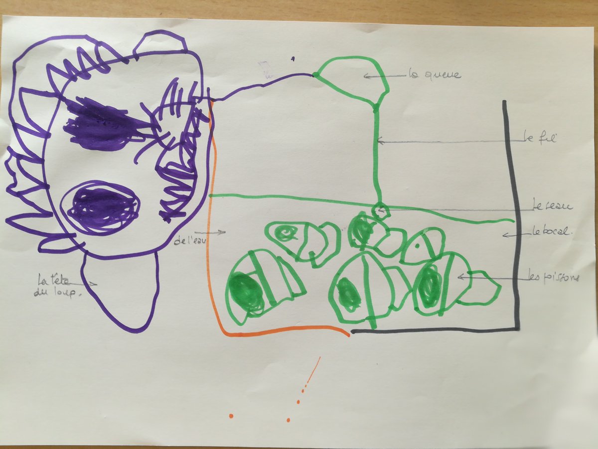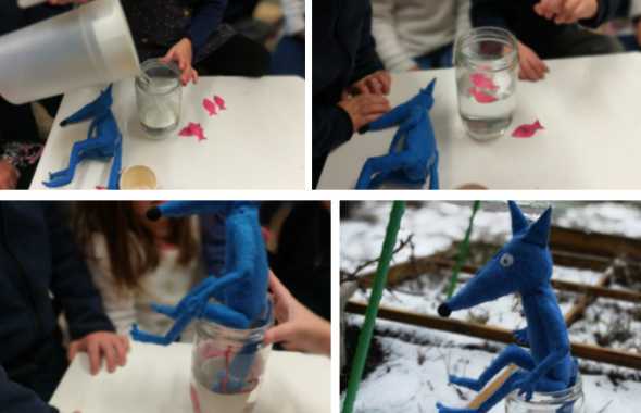 Voici les photos de la classe des Moyens de Nathéli, qui a également travaillé sur l'album "la grande pêche du loup" inspiré de l'histoire d'Ysengrin. Elle a fabriqué une peluche du loup (avec queue amovible), qui a servi de support à une activité de modélisation de la situation vécue par le pauvre loup. "Est-il possible que sa queue se retrouve vraiment piégée ?" "Qu'arrive-t-il à l'eau avec le froid ?" Les enfants ont mené l'expérience et en ont produit un schéma anoté avec l'aide de l'enseignante.