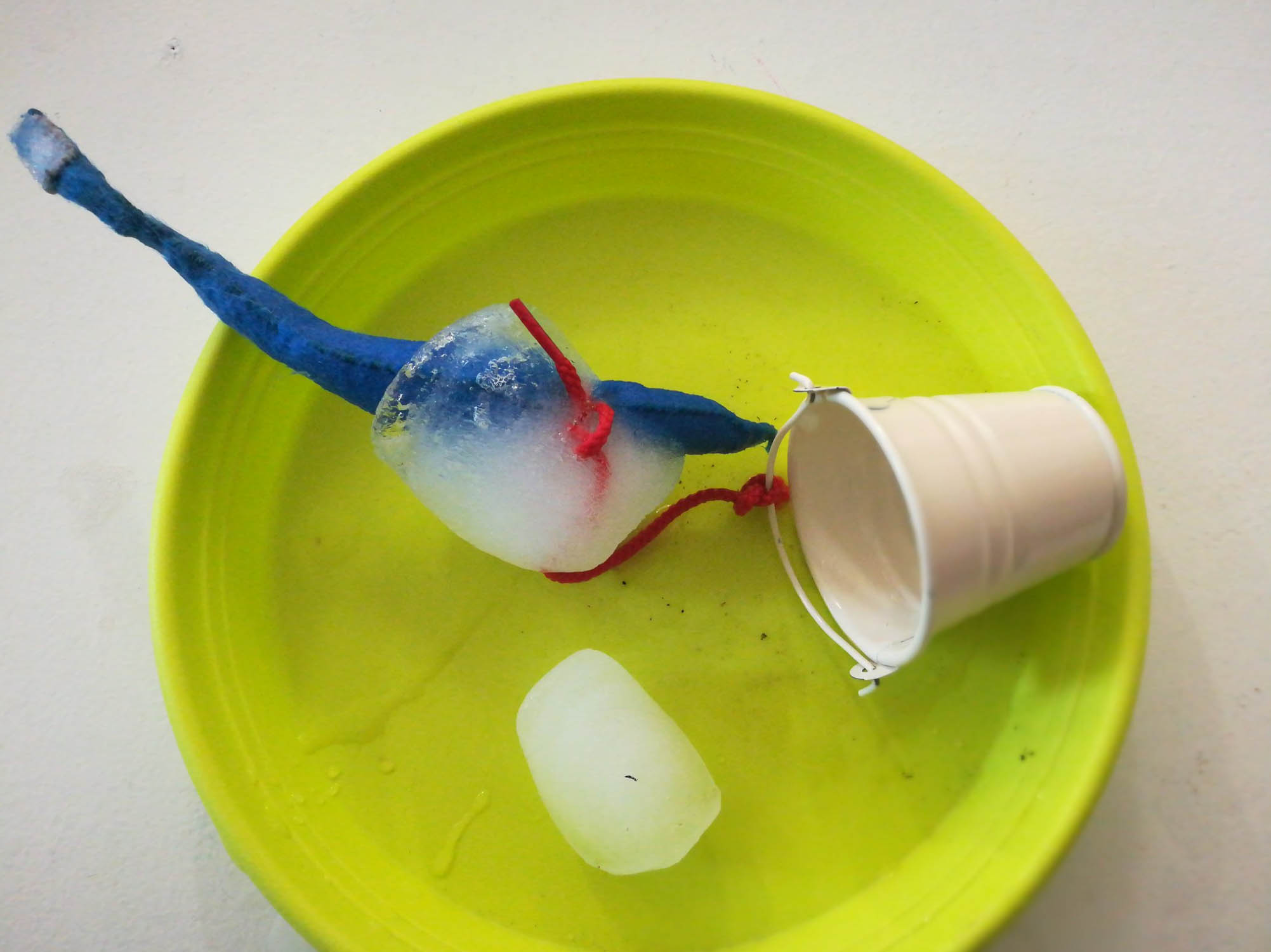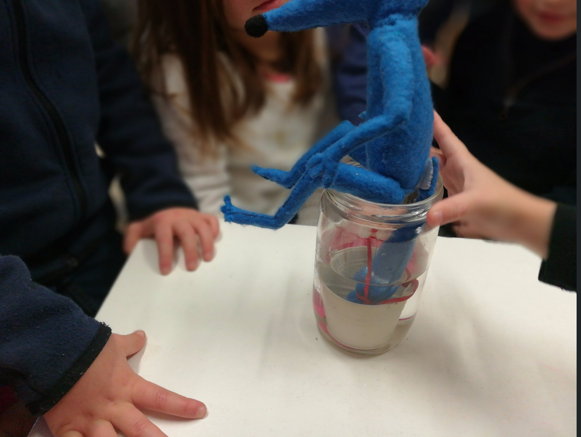 Après une nuit dehors et une autre au congélateur (le froit extérieur n'était pas assez intense), la queue du loup était figée dans la glace et s'est arrachée en tirant sur la peluche (comme dans l'histoire pour ce malheureux Ysengrin). Un nouveau problème s'est alors posé : impossible de sortir cette fichue queue de son bloc de glace ! Si les élèves ont proposé d'utiliser des outils, le temps a fait son oeuvre tout seul : pendant la réflexion et dans la chaleur de la classe, la queue a été libérée par la fonte de la glace.