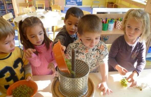 L'enseignant propose aux enfants de fabriquer du jus de raisin avec les grappes qui leur sont présentées. Après avoir essayé avec leurs doigts, l'enseignant les invite à utiliser d'autres objets de leur proche environnement. |