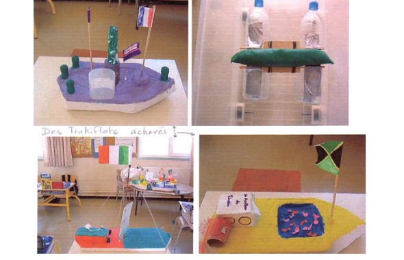 « Les élèves devaient construire, selon ce projet, un objet flottant tenant dans une boîte de 50 cm par 50 par 80 au maximum, qui soit capable de rester sur l’eau au moins 1 minute avec un lest de 1 kg. Ce projet s’inscrivait dans le contexte plus large d’un « défi science » proposé au groupe scolaire Moulin Fleuri à l’occasion de la fête de la science.