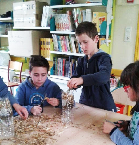 La classe de CM2 a choisi un travail sur des déchets non organiques et celle de CE2-CM1 sur le recyclage des déchets organiques accumulés notamment à la cantine. Ils ont fabriqué des mini-composteurs, puis mis en place un protocole expérimental visant à définir les éléments pour obtenir un bon compost : la terre, la lumière, l’air, la chaleur, mais pas trop, et l’eau.