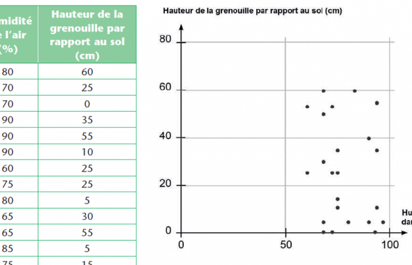 Déroulé : Les élèves observent un tableau de données (concernant le nombre d’hirondelles présentes à différentes dates de l’année, puis le comportement des grenouilles en fonction de la météo) et s’y appuient pour tracer un graphique qu’ils interprètent (phases 1 et 2). Ils constatent que cet outil permet de mettre en évidence la présence (ou l’absence) d’une relation entre deux événements (phase 3). Ils réfléchissent enfin à ce que la notion de corrélation implique dans la vie de tous les jours (phase 4).