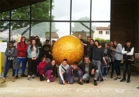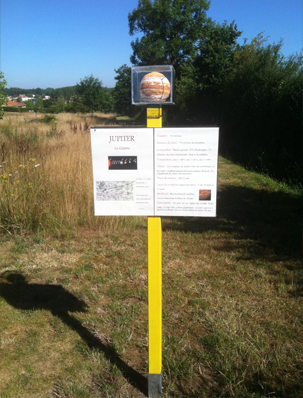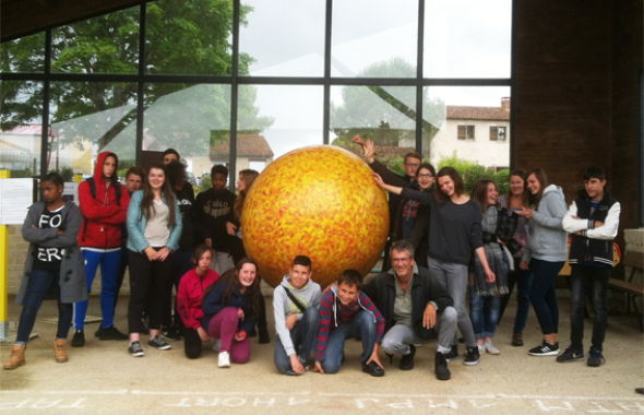 Un important travail de conversion a permis de réaliser une mise à l’échelle respectant les distances des planètes au soleil et les diamètres. Les élèves ont ensuite entrepris une étude de cartes IGN de manière à trouver des emplacements pour leurs astres dans leur commune, et ainsi réaliser la maquette à l’échelle un milliardième. Le passage d’un plan IGN à la localisation sur le terrain a parfois été difficile, mais l’interaction entre pair a permis aux élèves de comprendre la manière de s’y prendre. Les élèves ont été amenés à demander des autorisations pour placer les affiches correspondant aux planètes à l’intérieur de l’EREA mais aussi dans la ville en établissant une correspondance avec leurs interlocuteurs. Puis est venu le moment de réalisation de la maquette : la construction d’un Soleil de 1,39 m de diamètre a nécessité en particulier plusieurs essais, des échecs parfois, mais les classes ont ainsi relevé un défi technique pour trouver des matériaux adéquats.