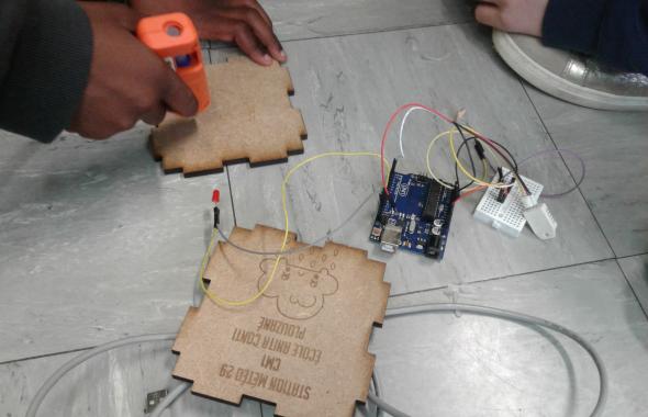 Après la rencontre avec un technicien de Météo France, la classe a décidé de travailler sur le thème de la météo. Plusieurs séances se sont succédées : Qu'est-ce que la météo? Comment mesurer la température? Comment faire monter le liquide dans le thermomètre? Comment fabriquer un thermomètre? A chaque fois les élèves ont essayé d'enrichir leur cahier d'expériences et de suivre la démarche scientifique : questionnement hypothèses expérimentation conclusion. Face au problème de la fabrication du thermomètre, et en observant une station météo "du commerce", la solution de l'utilisation de l'électronique s'est présentée. Avec l'aide du Fablab de l'IMT Atlantique, les élèves ont trouvé des solutions techniques pour la conception et la fabrication. Une visite de la station Météo France de Guipavas a ponctué le projet et confronté les élèves aux outils professionnels. De retour en classe les élèves ont assemblé les éléments créés puis ils ont testé l'efficacité et la précision de leur station.